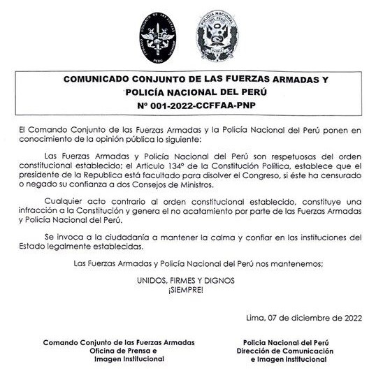 El Comando Conjunto de las Fuerzas Armadas (CCFFAA) se pronunció luego de que el presidente Pedro Castillo diera un golpe de Estado al disolver temporalmente el Congreso de la República y anunciar la reestructuración del sistema de justicia.